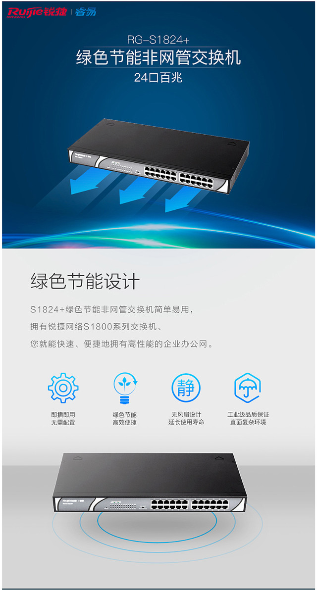 銳捷RG-S1824+ 企業級24口百兆智能非網管型綠色節能以太網交換機