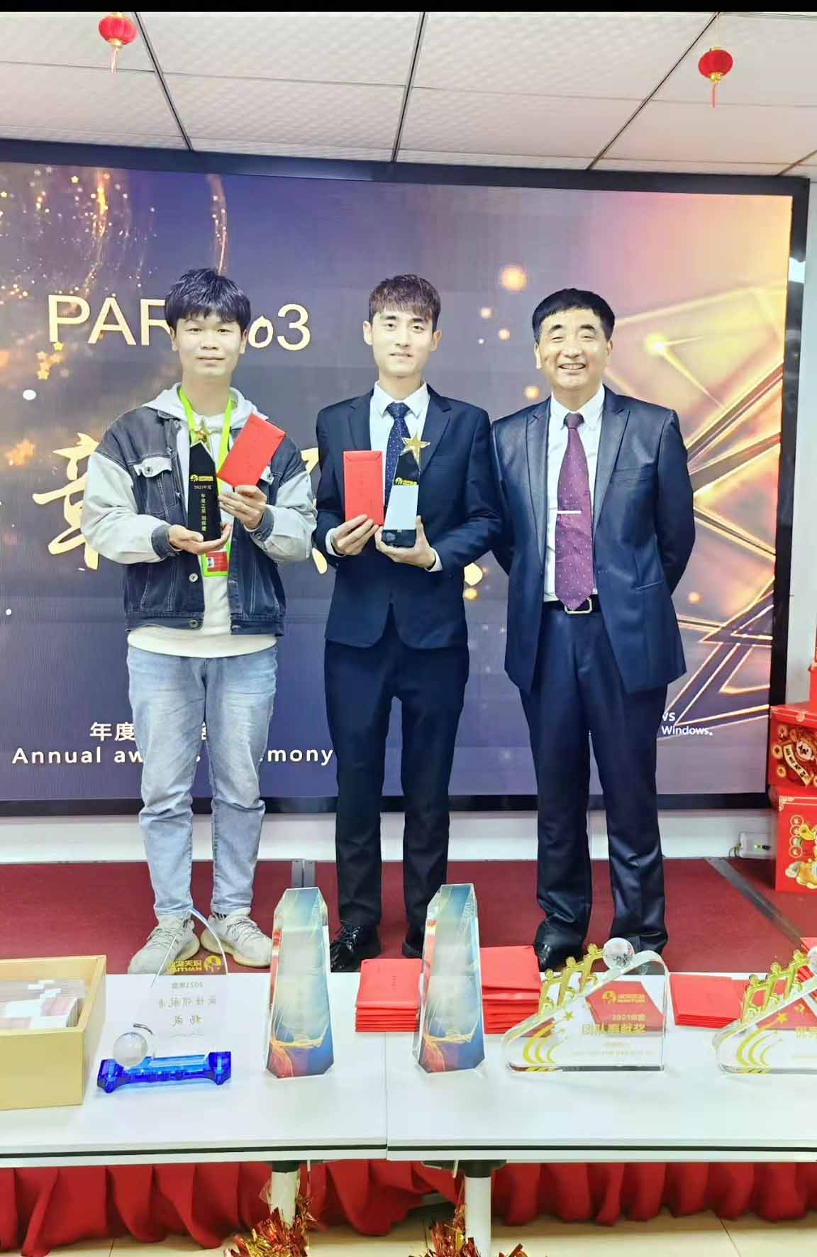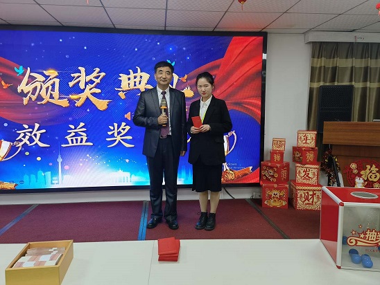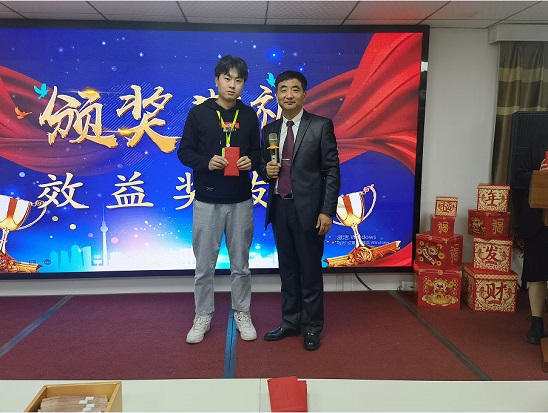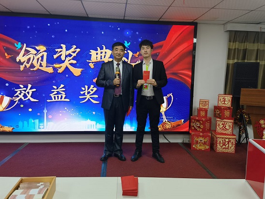 每位員工上臺領取效益獎,楊總頒獎