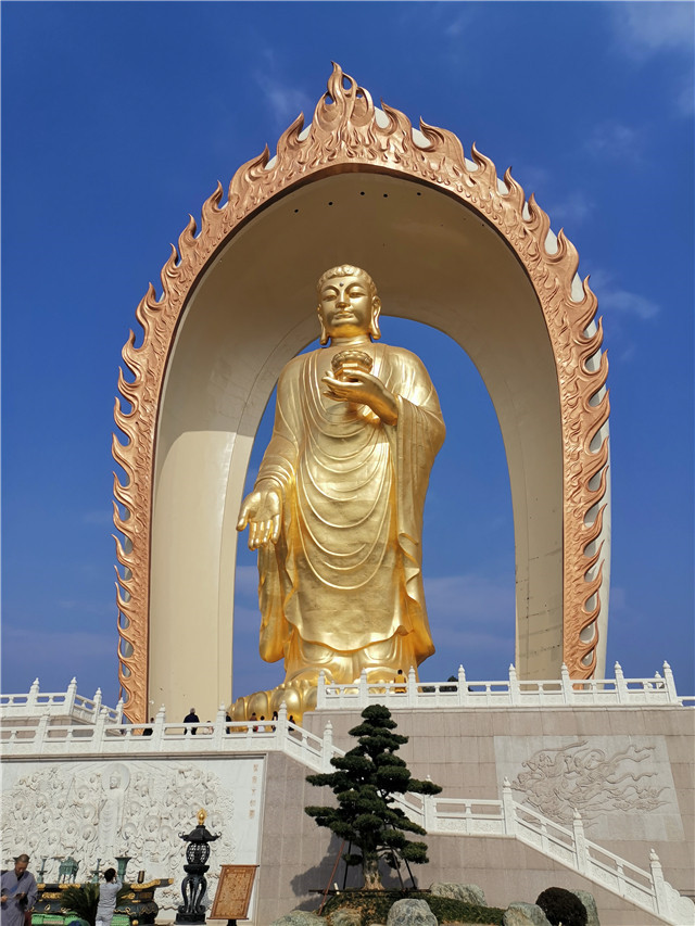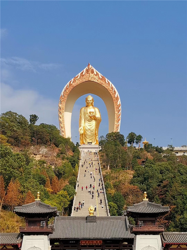 金秋的陽光溫馨恬靜,金秋的微風和煦輕柔,金秋的藍天白云飄逸,金秋的田野遍地金黃。團建第三天,我們來到了九江星子縣瞻仰世界最高48米大佛--東林大佛。經了解,大佛北依廬山主峰,群山環抱,山水相連,彌陀壇城,凈宗道場,朝圣勝地,是一方集朝圣、修行、弘法、教育、慈善為一體的凈土。高度48米,以表阿彌陀佛發的四十八大愿。總高81米,為至火焰寶蓋頂點之距,81米,以表九九八十一,意為修行成佛艱辛不易。在阿彌陀佛像里面,是中國及全球第一高的。我們帶著無比虔誠的心瞻仰著。此刻的心靈,猶如明鏡一般清澈、透明,遠離塵囂!